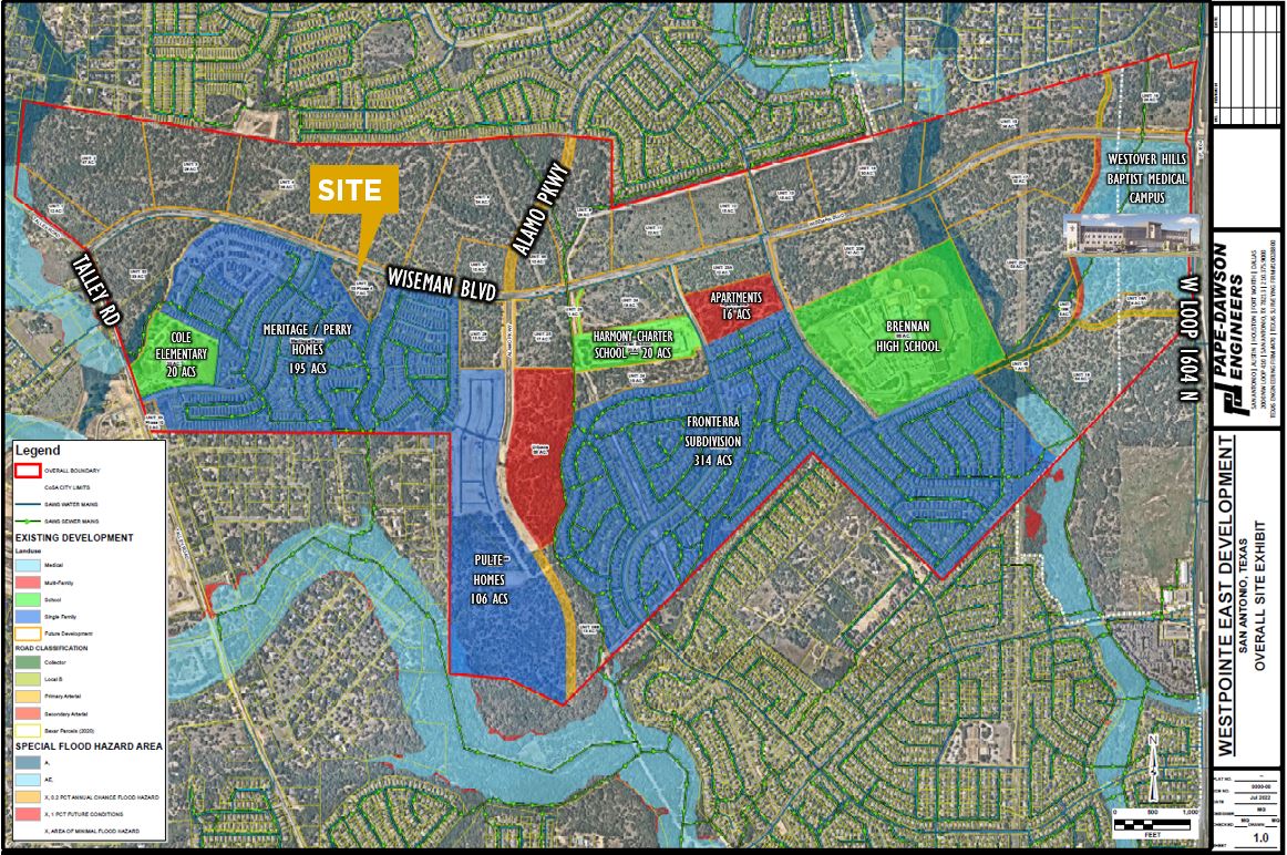 LOCATION: Wiseman Blvd between Tillman Ridge & Alamo Parkway, surrounded by thousands of new homes and apartment units. Situated on Wiseman Boulevard, less than 2 miles from Brennan High School, Loop 1604 & the future Westover Hills Baptist Medical Campus – https://www.baptisthealthsystem.com/locations/detail/westover-hills-baptist-hospital.
